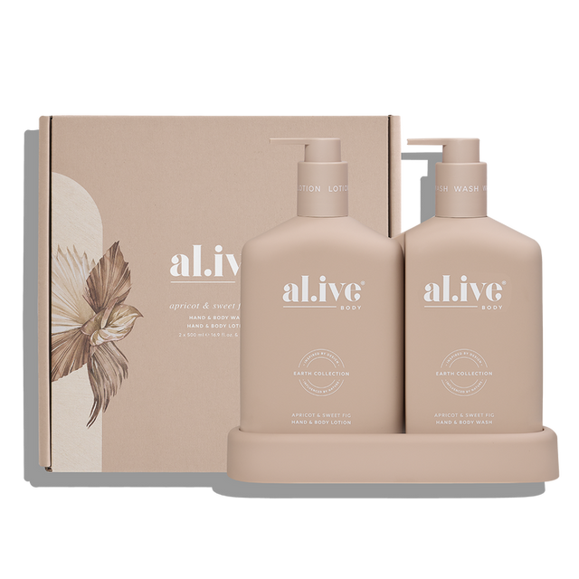 The al.ive body Wash & Lotion Duo in Apricot & Sweet Fig is formulated with naturally derived ingredients and enriched with fig extract and apricot oil to cleanse, deeply hydrate and soften the skin gently.