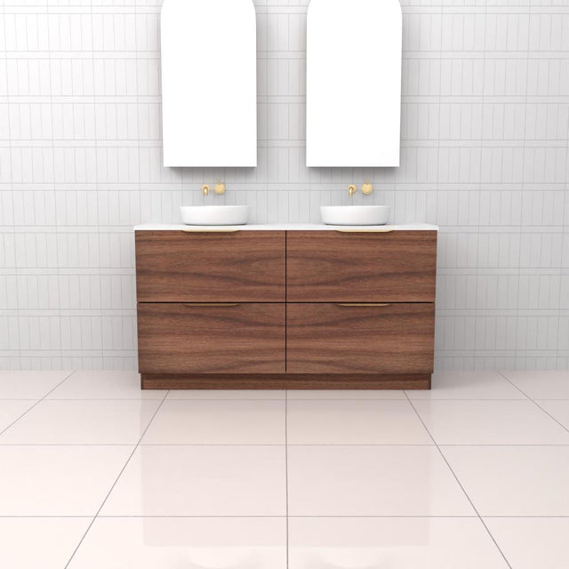 Introducing Celeste Duo Freestanding Bathroom Vanity in stunning Walnut  timber veneer. Expertly made in Australia, this vanity combines aesthetic appeal with exceptional functionality.