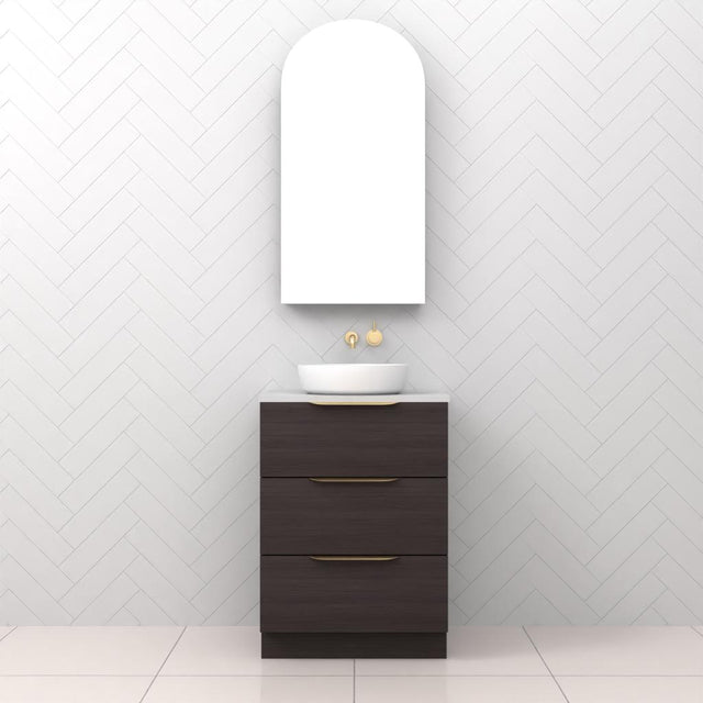 Celeste Trio - 600mm Espresso Oak Freestanding Vanity - No Benchtop / Brushed Copper is backordered and will ship as soon as it is back in stock.